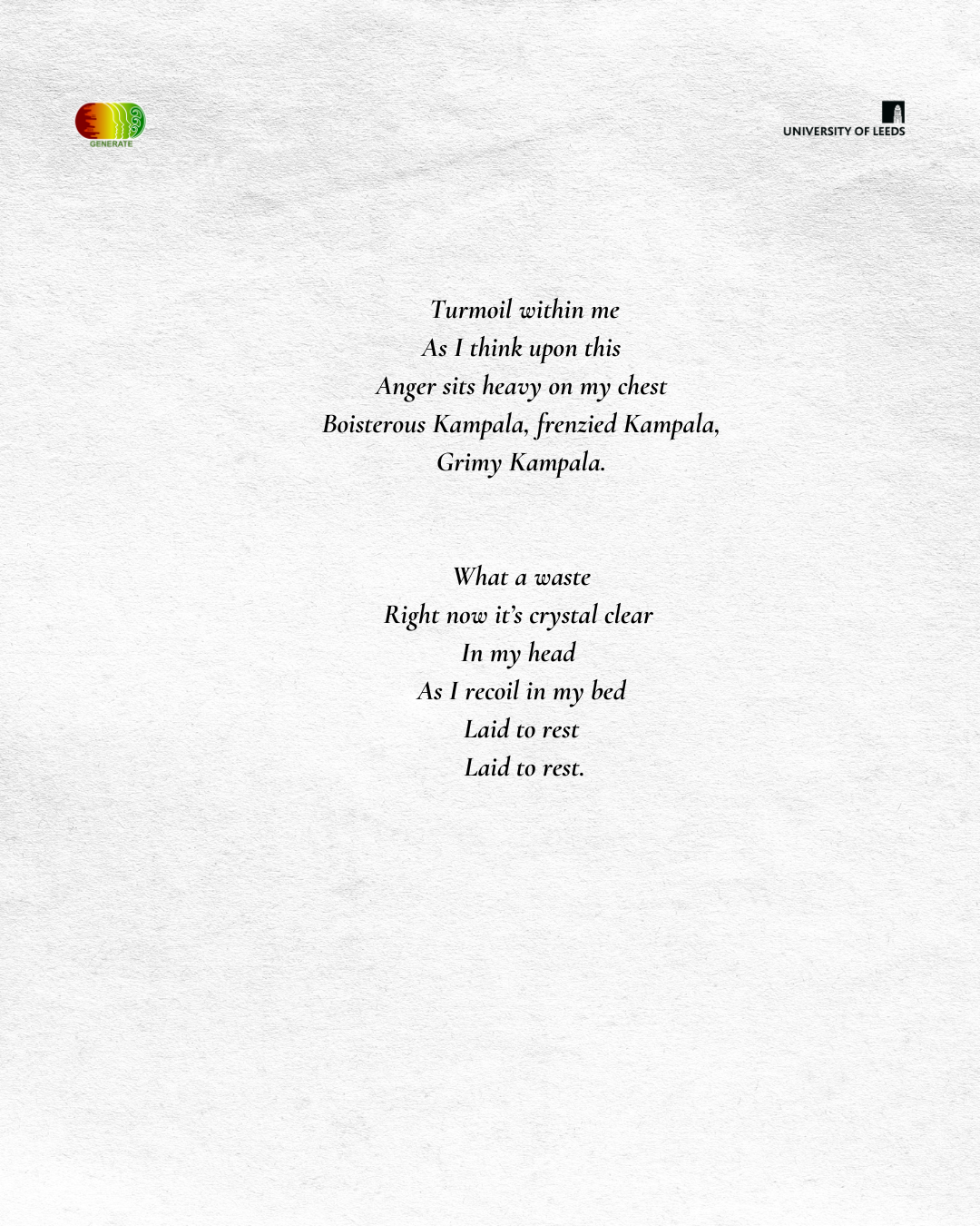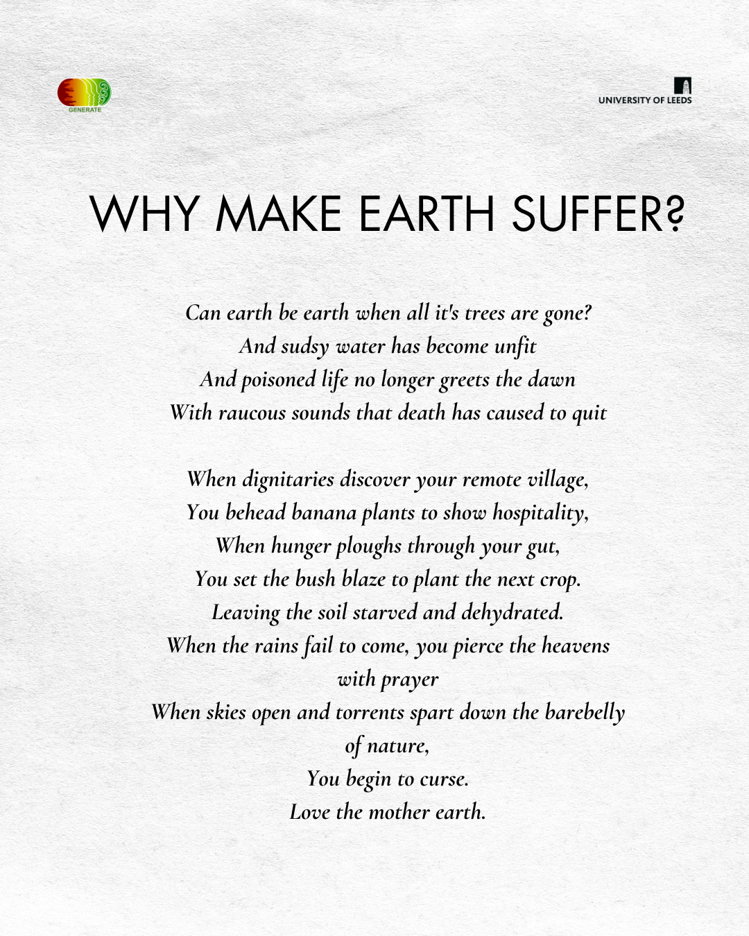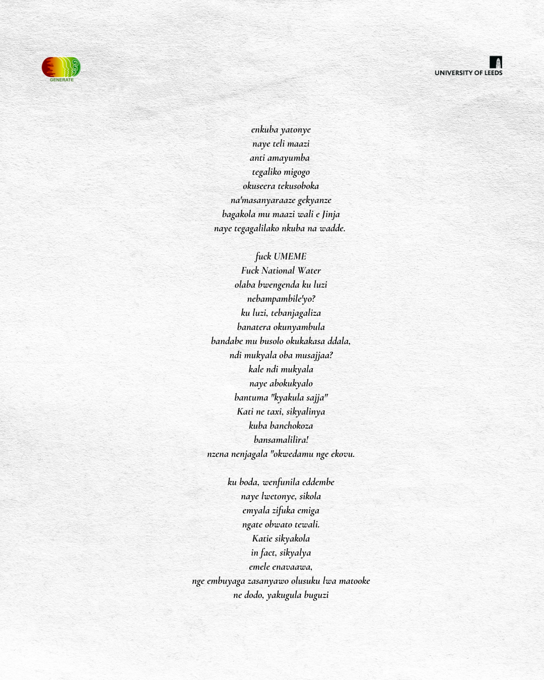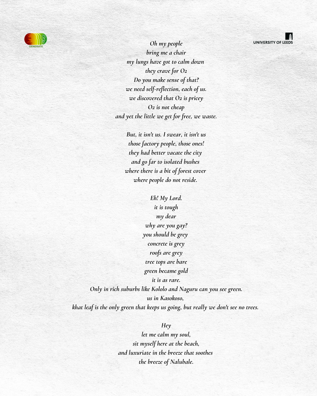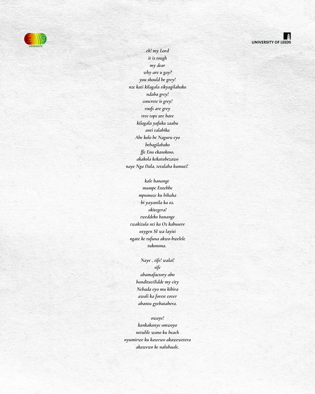 The workshop produced 15 poems on environmental themes, some of which are shared here. We have not included the poets’ names to protect their identities in light of the ongoing violent and political discrimination against sexual and gender diverse communities in Uganda.