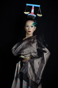 Asih is the restorer superhero who selflessly loves the sick and advocates for better healthcare and effective healing for all. She has a sacred crystal stone wand and an anti-virus shield that can fight radiation, pollution, and free radicals. The rest of her costume is made of bubble wrap to critique the growth of e-commerce and single-use plastics. Her wand is in the shape of a red ribbon: the universal symbol of awareness and support for people living with HIV/AIDS.